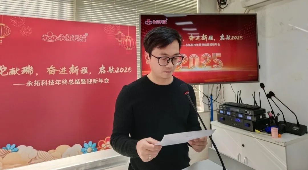 年终总结会上,永拓科技董事总经理钟锦祥上台发表致辞,回望过去一年的风雨兼程,他表达了对团队的感激和祝福。展望新岁,他表示冲锋的号角已再次吹响,希望大家能够勇往直前、破浪前行,朝着更高的目标迈进,齐心协力开创更美好的未来。
