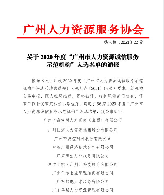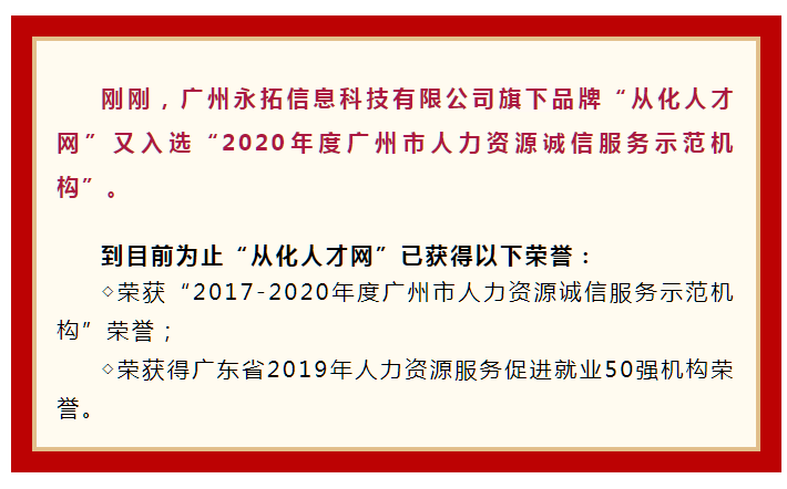 荣获“广州市科技创新小巨人企业”、“国家高新技术企业”认定、“从化2012—2013年度科学技术进步奖三等奖” 、广州市经贸系统电子商务"十强示范单位"、2016年广东省“互联网+”试点项目单位、广东省2019年人力资源服务促进就业50强机构荣誉和“2017-2020年度广州市人力资源诚信服务示范机构”认定等荣誉。